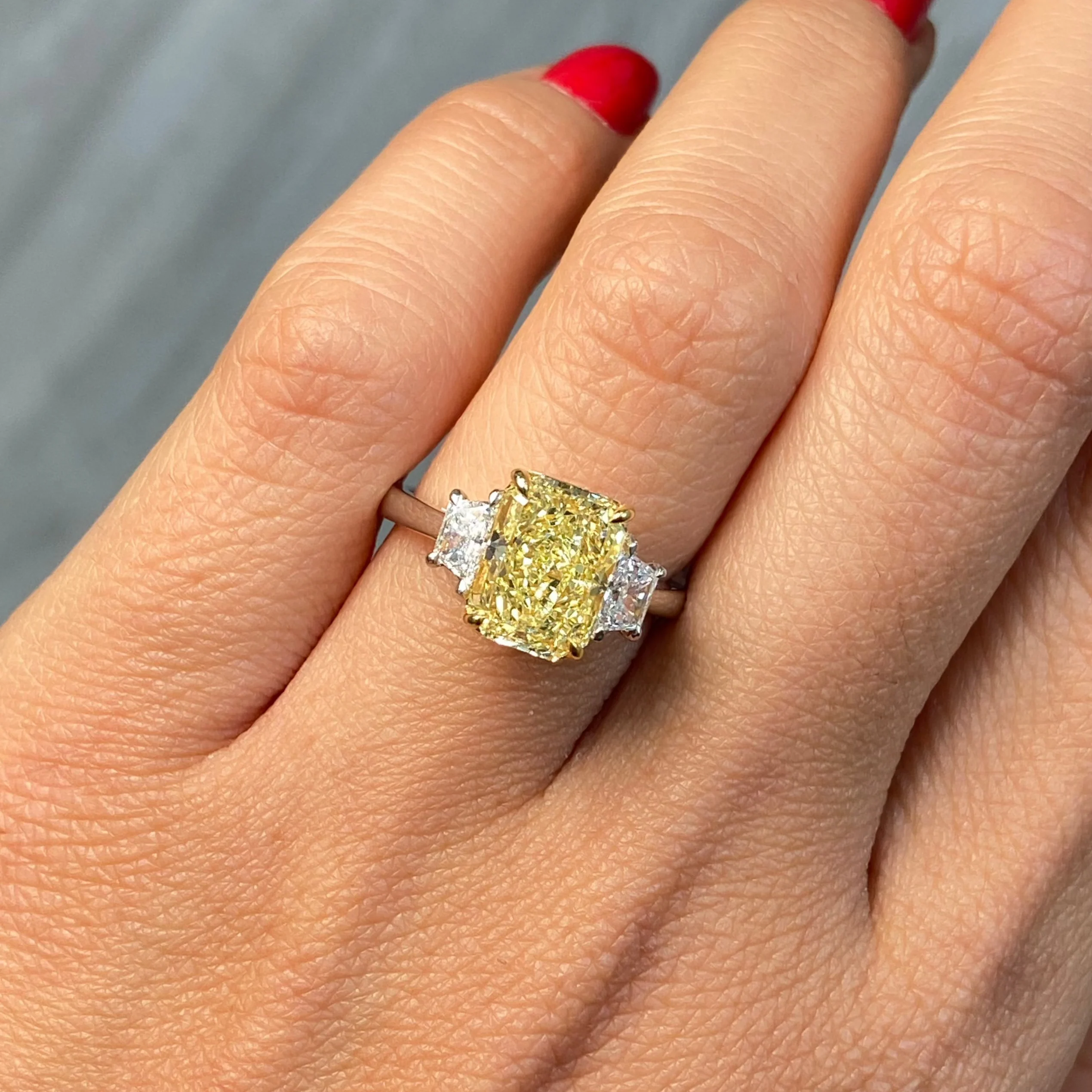 3 Carat Fancy Yellow Elongated Radiant Diamond Three Stone Ring